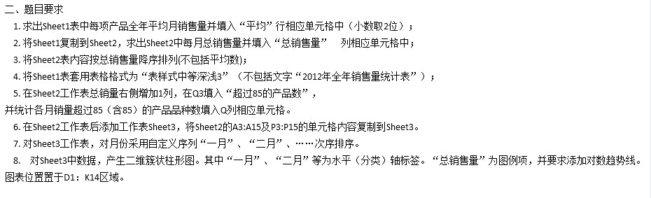 提示: 1.严格按照要求步骤顺序完成,否则会因为某些表格内容不一致导致不得分 2.注意每一步操作要求完成的工作表,做错表格不仅该步骤不得分,也会影响其他步骤分数 3.Excel公式和函数中各个标点符号均使用英文标点符号 4.填充柄使用要熟练以提高效率 ![]() 此题为excel题中题量较多一题,涉及知识点较多。 步骤1、2 平均函数与求和函数 步骤3 选定区域的排序对话框设置条件排序 步骤4 套用表格样式 步骤5 countif函数统计 步骤6 不连续区域的同时选择(利用ctrl键) 步骤7 排序对话框“自定义序列”排序 步骤8 图表生成,图表参数设定,对数趋势线添加,及对齐指定区域(对齐时按住ALT键使图表边缘严格贴合单元格边缘)。 |