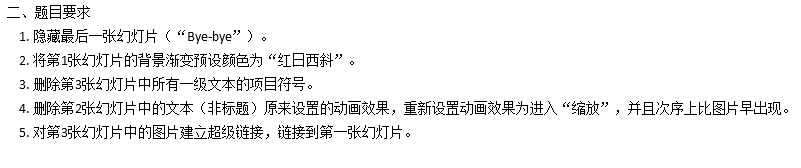PowerPoint题目难度较低,按步骤完成每个操作即可,注意读题,看参数设置的内容是某张幻灯片还是所有幻灯片。